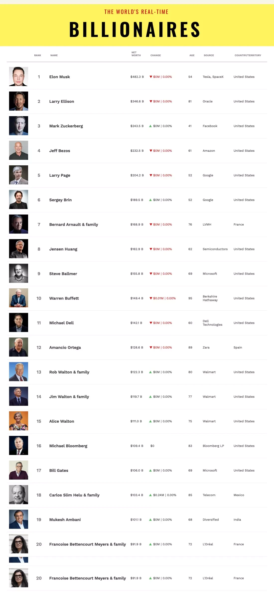 Интересно, что на фоне этой истории все остальные миллиардеры выглядят как будто немного… бедновато. Второе место занимает Ларри Эллисон из Oracle — примерно на $150 миллиардов меньше. Марк Цукерберг с $246 миллиардами держится третьим, а Джефф Безос чуть позади — $235 миллиардов. Замыкает пятёрку Ларри Пейдж из Google со своими «скромными» $203 миллиардами.
