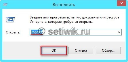 И так перейдем к действиям, нажимаем на клавиатуре горячие клавиши Windows + R. Вызываем окно выполнить. Теперь вписываем в него команду regedit которая вывозит редактор реестра жмем ОК.